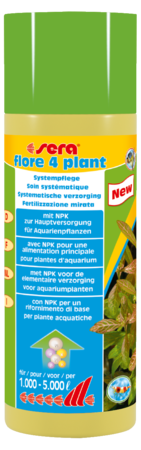 Το sera flore 4 plant δημιουργήθηκε για την χορήγηση των υδρόβιων φυτών σε φυτεμένα (aquascapes) και Ολλανδικού τύπου ενυδρεία, αζώτου, φωσφόρου και καλίου σε ιδανικές αναλογίες – για υγιή και δυναμική ανάπτυξη. Το sera flore 4 plant είναι καλά ανεκτό από τα ασπόνδυλα.