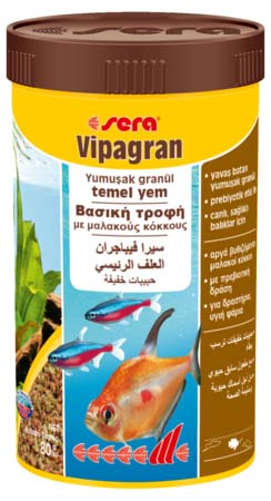 Η sera Vipagran είναι η δημοφιλής βασική τροφή που αποτελείται από προσεκτικά κατασκευασμένους κόκκους για όλα τα ψάρια, ειδικά για εκείνα που τρέφονται στα μεσαία στρώματα του νερού.