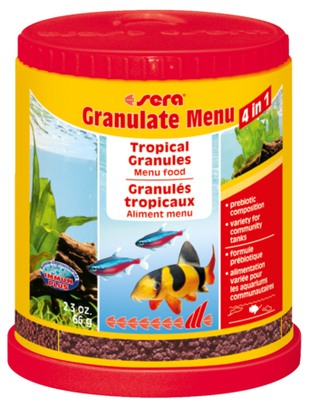 sera Granulate Menu is the staple food consisting of 4 types of carefully manufactured granules that can be dosed separately for all fish in a community tank that mainly eat in the middle water layer.