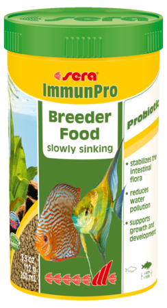 sera ImmunPro is the slowly sinking breeder food for all ornamental fish above 4 cm (1.6 in.). The probiotics are applied to the food in a particularly gentle procedure and stabilize the intestinal flora of the ornamental fish. They ensure reduced water pollution because of more efficient food utilization. Due to the high protein percentage of more than 50%, the addition of probiotics and other functional ingredients such as MOS, Haematococcus and Spirulina, the breeder food ensures quick growth, strong development and brilliant coloration of the fish.