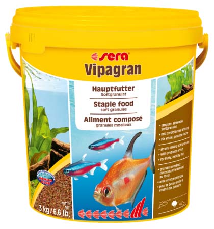 Η sera Vipagran είναι η δημοφιλής βασική τροφή που αποτελείται από προσεκτικά κατασκευασμένους κόκκους για όλα τα ψάρια, ειδικά για εκείνα που τρέφονται στα μεσαία στρώματα του νερού.