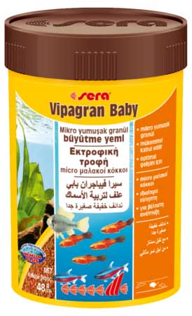 Η τροφή sera Vipagran Baby είναι η τροφή ανάπτυξης που αποτελείται από προσεκτικά κατασκευασμένους μικρό-κοκκους για όλα τα νεαρά ψάρια που τρώνε στο μεσαίο επίπεδο του νερού.