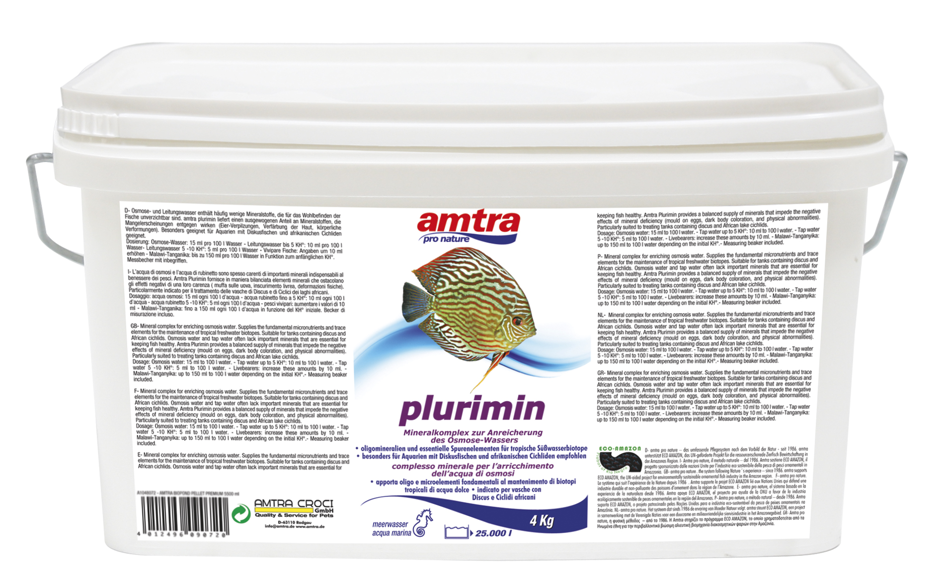 Supplies the fundamental micronutrients and trace elements for the maintenance of tropical freshwater biotopes. Suitable for tanks containing discus and African cichlids. Osmosis water and tap water often lack important minerals that are essential for keeping fish healthy. Amtra Plurimin provides a balanced supply of minerals that impede the negative effects of mineral deficiency (mould on eggs, dark body coloration, and physical abnormalities). Particularly suited to treating tanks containing discus and African lake cichlids.