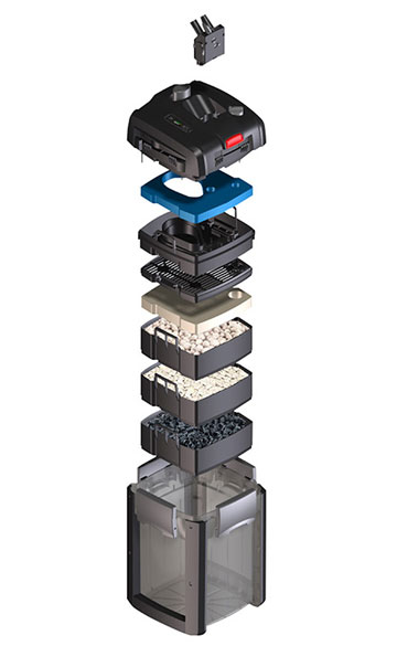 There are 3 sizes available for aquariums up to 250, 350 and 600 litres. The models 250 and 350 are also available with an integrated heater as thermo filter (T). In addition, the professionel 350e can be electronically controlled from a PC.