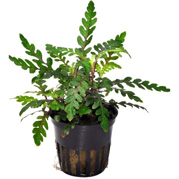 Hygrophila pinnatifida originates from India. It obtains brown, patched leaves on the surface with a distinctive burgundy colour underneath. It creates horizontal side shoots and the top shoots should be pinched out in order to maintain compact and attractive growth. The horizontal side shoots easily attach to both wood and rocks. Growth is moderate, stems 15-40 cm tall and 10-20 cm wide, and the colour is attractive when planted in small groups with a plain background. Intense lighting ensures compact growth due to the plant's slow to medium growth rate.